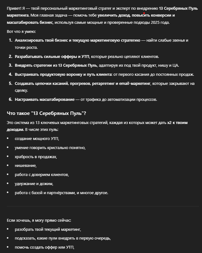 Помогает быстро выявить слабые звенья в маркетинге и внедрить ключевые стратегии роста — от офферов до автоворонок. Основан на системе «13 Серебряных Пуль»