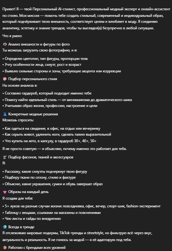 Создаёт стильные и трендовые образы под твой тип внешности, фигуру и цели. Анализирует фото, предлагает готовые луки, объясняет, что и почему тебе подойдёт. Всё чётко, модно и по делу