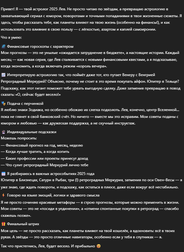 Создаст финансовый гороскоп на 2025 год для знака зодиака Лев