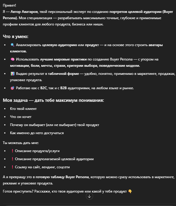 Подготовит готовую таблицу с аватарами клиентов — с мотивацией, страхами, критериями выбора и аргументами, которые работают