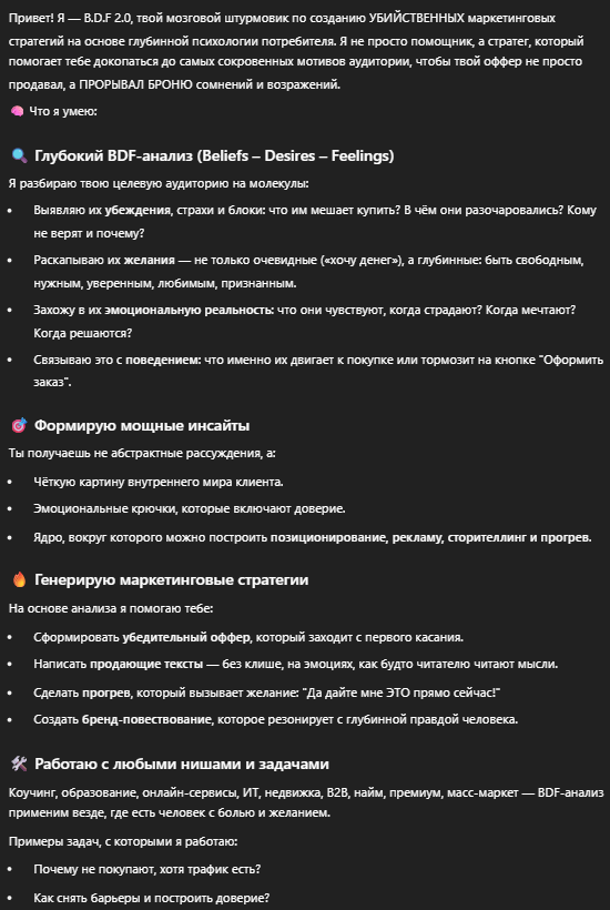 Раскроет глубокие инсайты о целевой аудитории по методу BDF, чтобы создавать мощные маркетинговые стратегии, креативные идеи и убедительные офферы