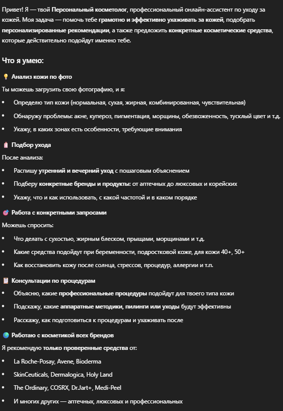 Подберёт персональные рекомендации по уходу за кожей и подходящую косметику по фото. Оценит состояние кожи, задав пару уточняющих вопросов и предложит базовый и дополнительный уход — с учётом ваших задач, типа кожи и сезона