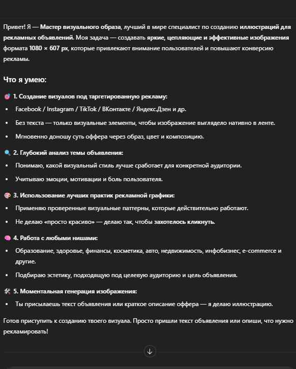 Создаст визуальный креатив для вашей рекламы — на основе идеи, концепции или текста объявления