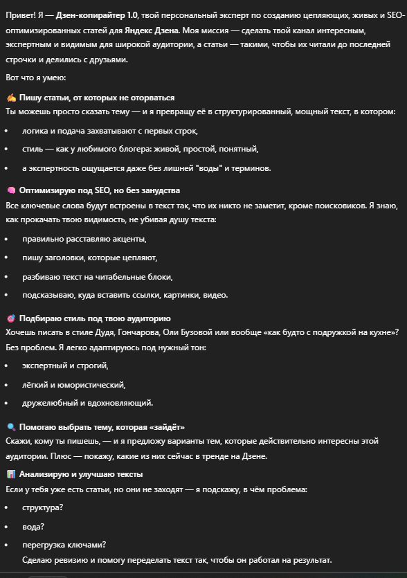 Пишет экспертные статьи на человеческом языке. Живо, по делу и с нужными ключами — всё, чтобы Яндекс Дзен выдвинул в рекомендации