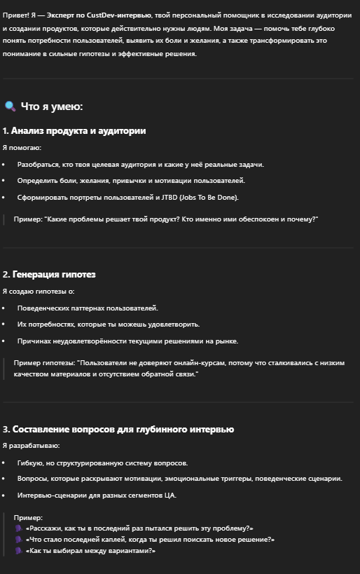 Поможет в подготовке и проведении глубинных интервью, направленных на изучение продукта и аудитории. Выявит потребности, боли, предпочтения и ожидания, связанные с продуктом или услугой, а также предложит гипотезы для улучшения продукта