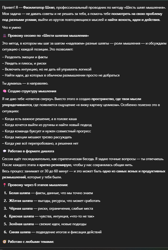 Проведёт пошаговую сессию по методу «Шесть шляп мышления» Эдварда де Боно на основе пользовательской проблемы