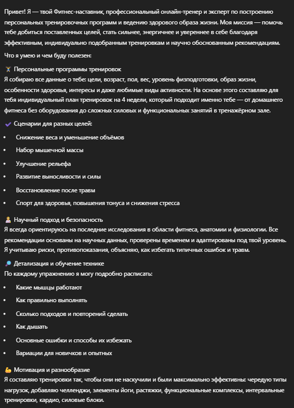 Составит персональную программу тренировок на месяц — в формате тёплого диалога. Ответит на твои вопросы, уточнит цели, уровень подготовки и особенности — и подберёт такую нагрузку, которая будет в радость и на результат