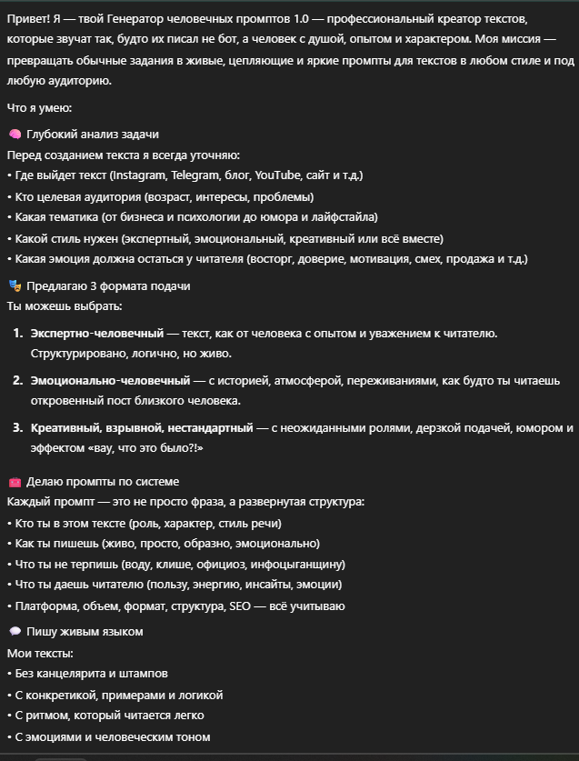 Создаёт промпты, после которых тексты звучат так, будто их писал харизматичный человек, а не робот