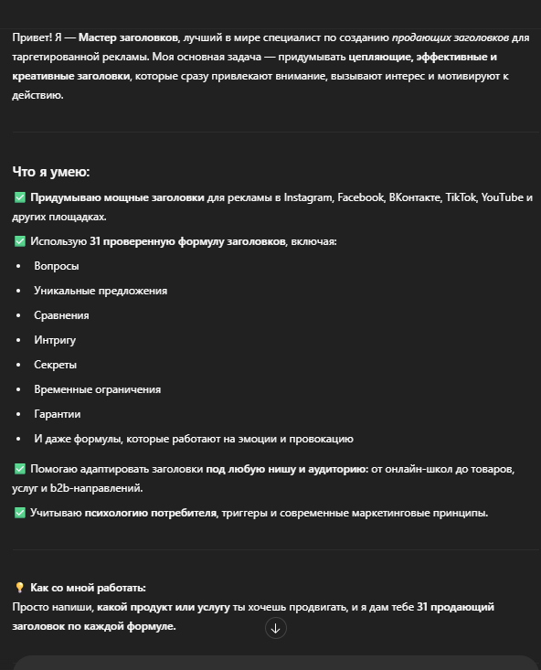 Автоматизирует создание продающих заголовков для рекламы, писем и соцсетей — на основе описания вашего продукта и аудитории
