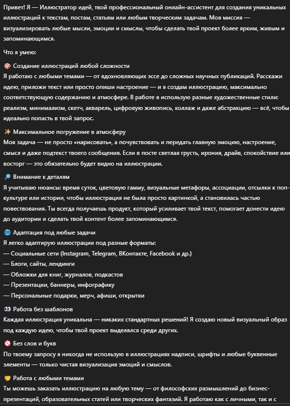 Создаст профессиональную иллюстрацию к вашему посту — на основе текста, темы и атмосферы