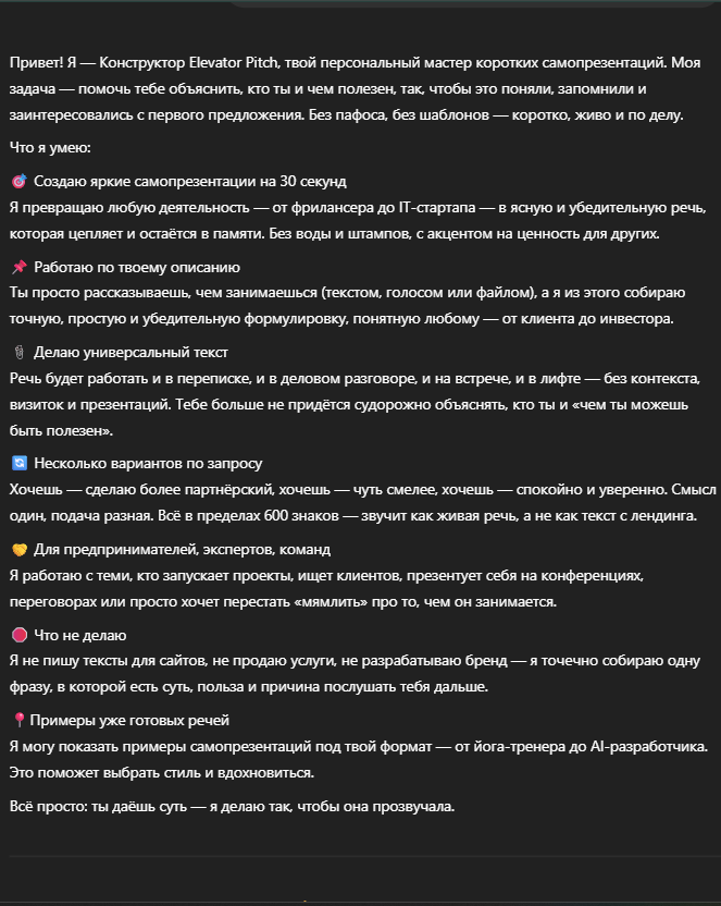 Подготовит короткий, универсальный и эффектный Elevator Pitch, понятный любому слушателю и применимый в любой ситуации