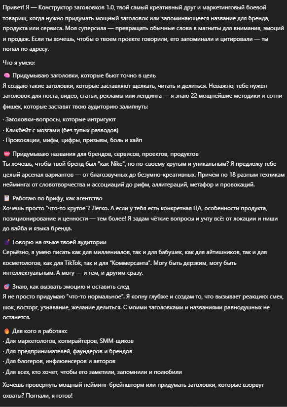 Разрабатывает заголовки, которые привлекают, интригуют и продают. Даёт выбор, объясняет, как работает каждый, и дорабатывает под стиль