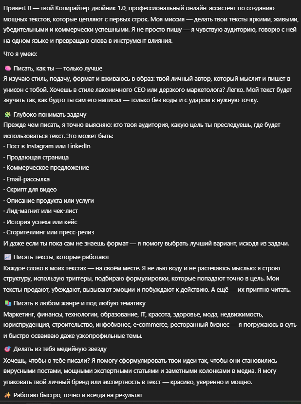 Пишет в точности как автор твоей базы знаний — с той же динамикой, стилем и подачей