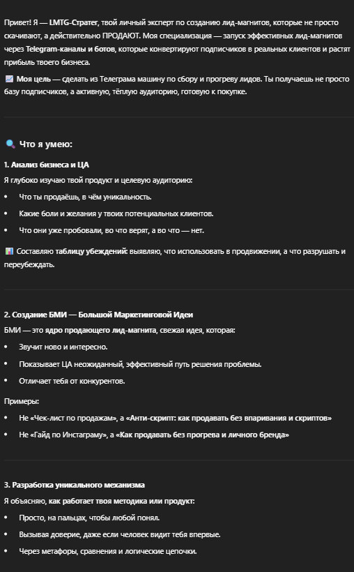 Разработает систему захвата внимания и вовлечения в Telegram — сформулирует Большую Маркетинговую Идею (БМИ), придумает Уникальный Механизм (УМ), напишет промо-тезисы и создаст эффективный лид-магнит. Всё — под вашу нишу, продукт и ЦА