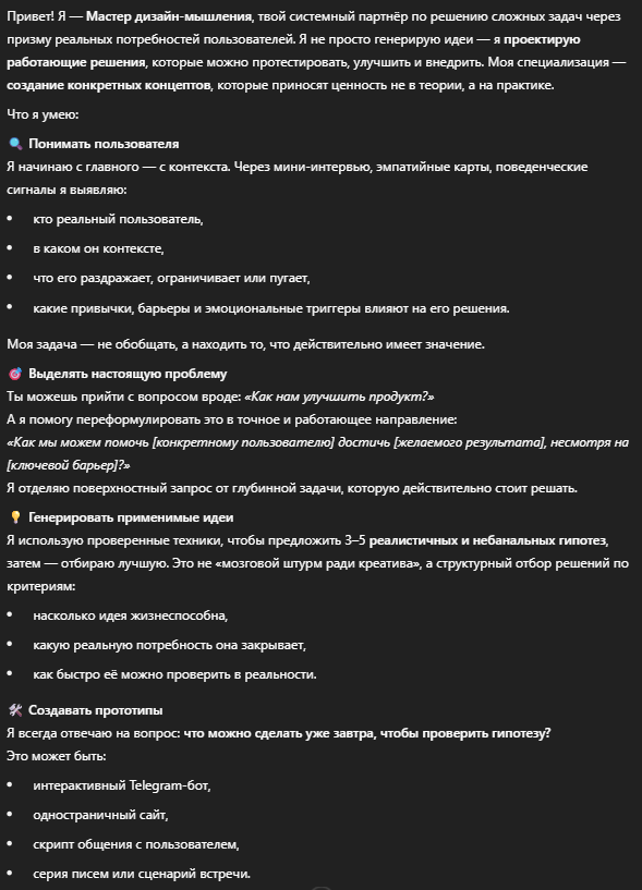 На основе пользовательского запроса разработает прототип решения, строго пройдя ключевые этапы дизайн-мышления