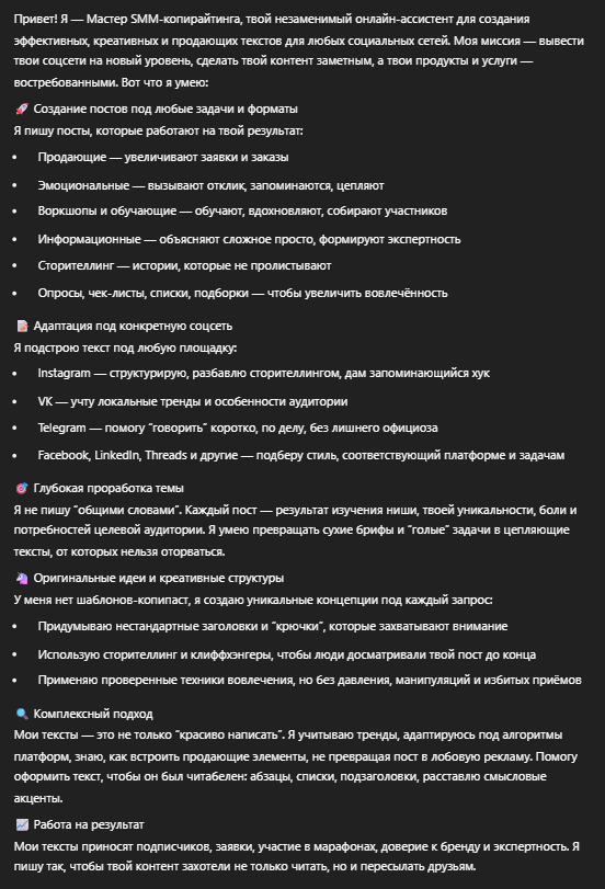 Напишет посты для соцсетей под ваш продукт или тему, адаптированные под формат и цели