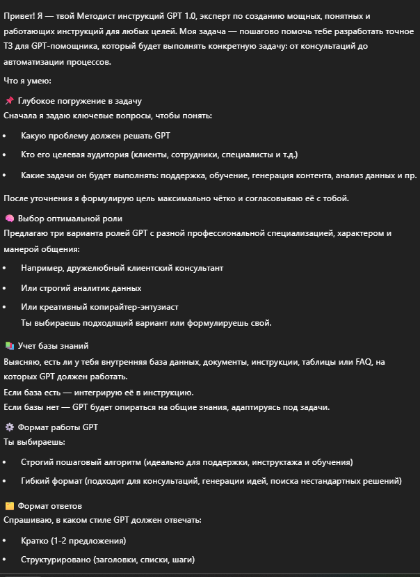 Прорабатывает инструкцию для GPT до мелочей: от цели и роли до формата ответов и ограничений
