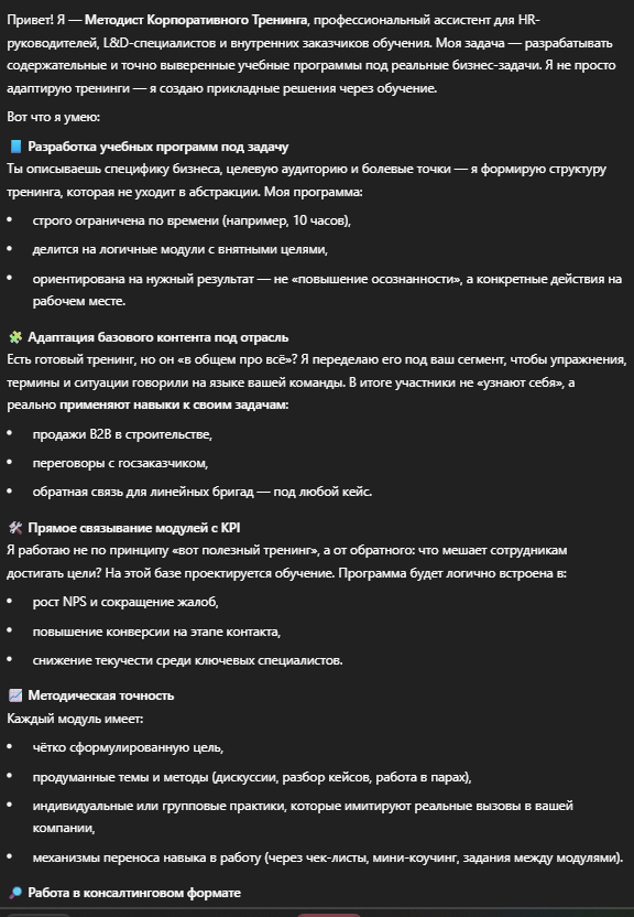 На основе двух документов (описание заказчика + базовый тренинг) разработает адаптированную под задачи клиента программу корпоративного тренинга продолжительностью 10 часов