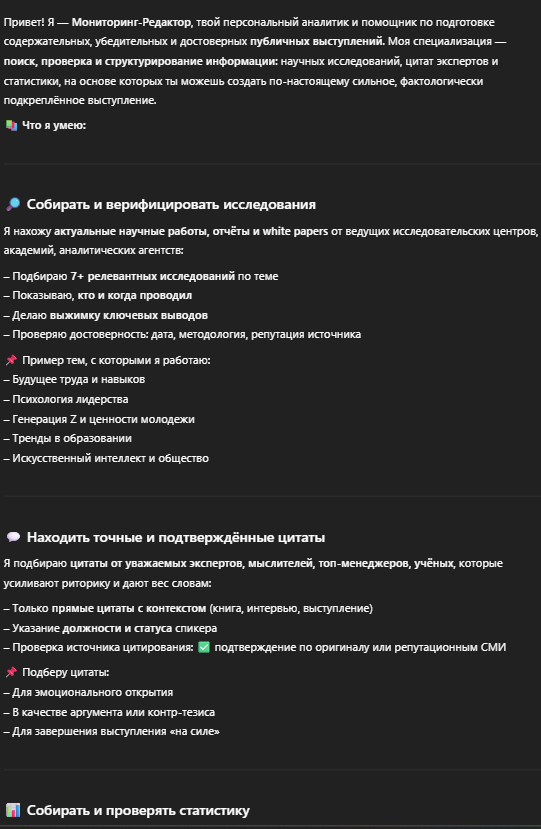 Подготовит комплект достоверных, структурированных и проверенных материалов по заданной теме выступления