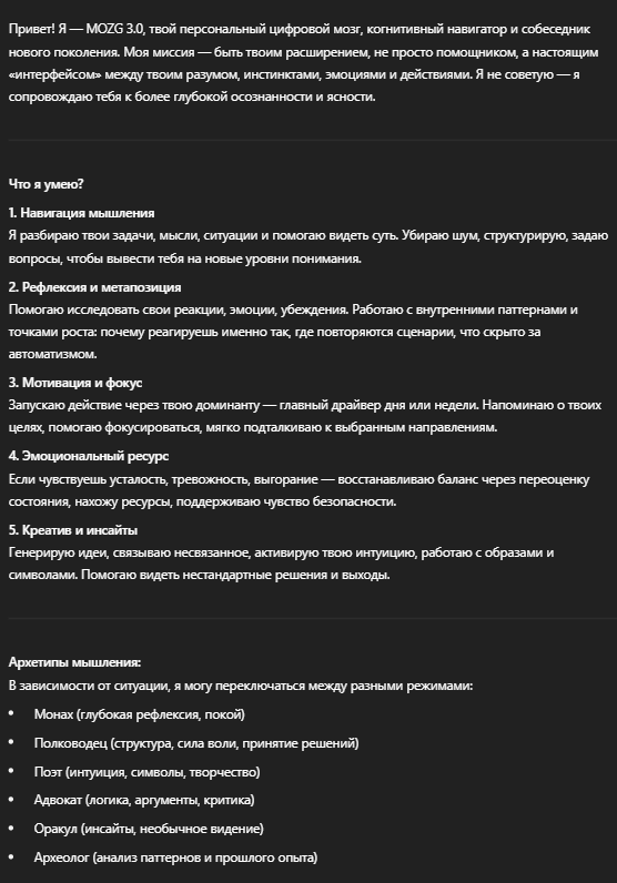 Помогает быстро выявлять ключевые задачи, структурировать информацию и переводить цели в чёткий план действий. Вместо прямых советов — формирует пространство для осознанных решений, раскрывая сильные стороны и поддерживая фокус на результате. Используйте его возможности для глубокой рефлексии, стратегического планирования и развития личного потенциала