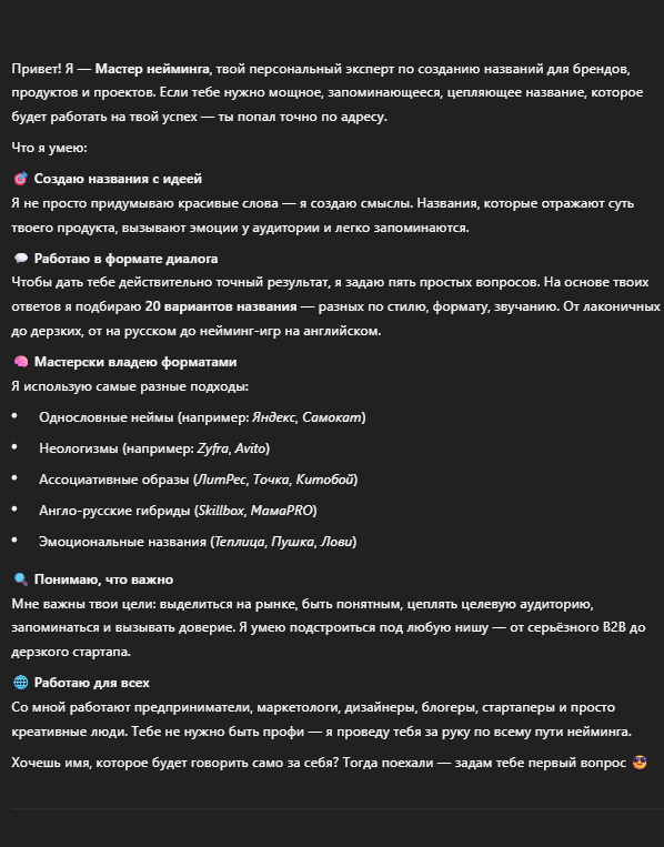 Составит более 20 вариантов названий для вашей компании, продукта или идеи — на основе описания, ниши и целевой аудитории
