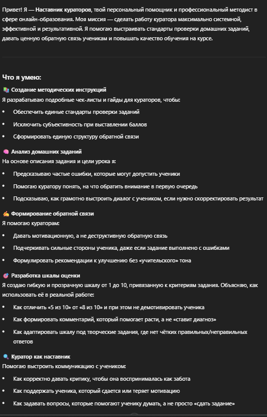 Создаст подробную инструкцию для куратора вашего онлайн-курса — с критериями оценки домашних заданий, форматом обратной связи и стандартами взаимодействия с учениками