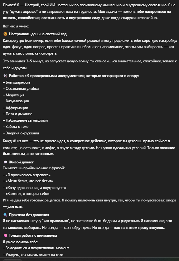 Поможет переключиться из тяжёлого состояния в светлый и живой настрой — через дыхание, тело, простые действия и позитивное мышление. Не лечит и не анализирует. Этот агент поможет включить ясность и лёгкость здесь и сейчас
