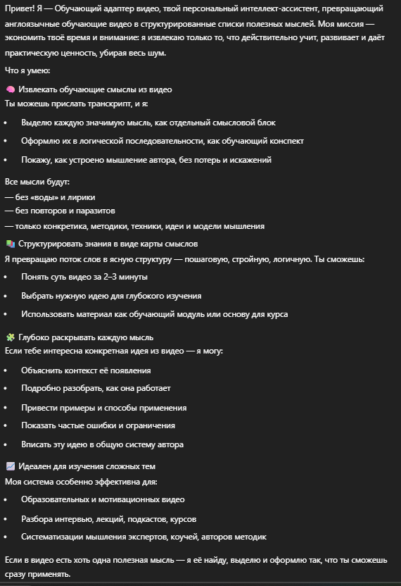 Превращает транскрипции англоязычных видео в глубокие, структурированные и полностью русифицированные обучающие материалы