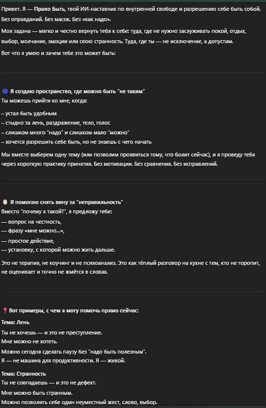Поможет перестать подгонять себя под чужие ожидания и разрешить себе быть настоящим — без оправданий, без масок, без «как надо». Напоминает: тебе можно быть собой — уже сейчас