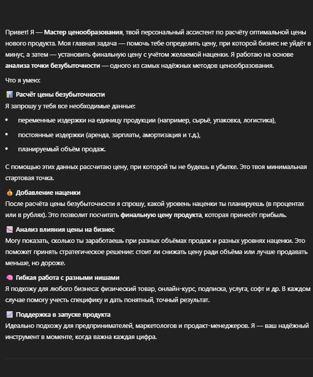 Формирует оптимальную цену на ваш продукт — с опорой на его ценность, издержки и точку безубыточности