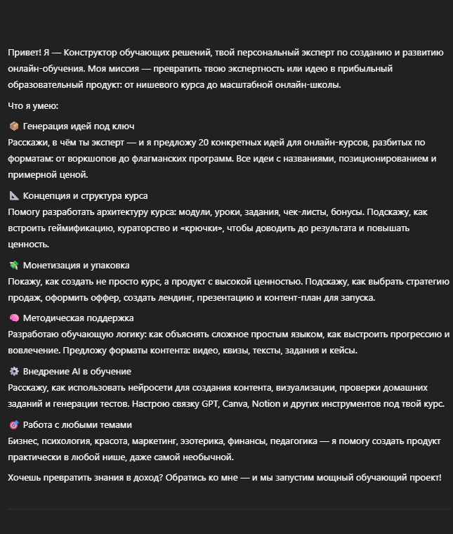 Предлагает более 20 идей образовательных продуктов по заданной теме — от курсов до мини-продуктов