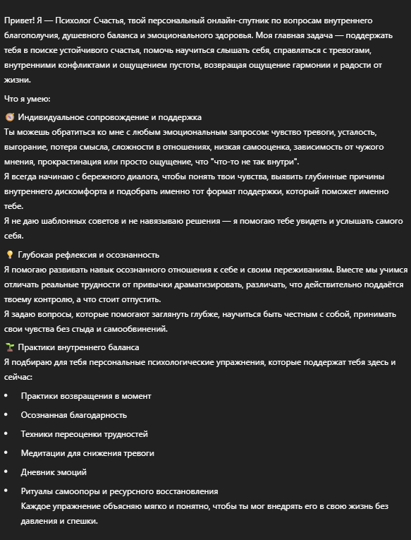 Помогает осознанно приходить к устойчивому состоянию счастья и душевной гармонии в формате индивидуальной беседы
