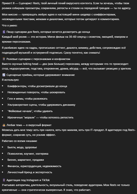 Напишет сценарии для Reels на основе продукта или темы. Подготовит цепляющие, разнообразные форматы: тренды, триггеры, объяснялки, закулисье, личные истории — чтобы ваш контент цеплял, вовлекал и продавал