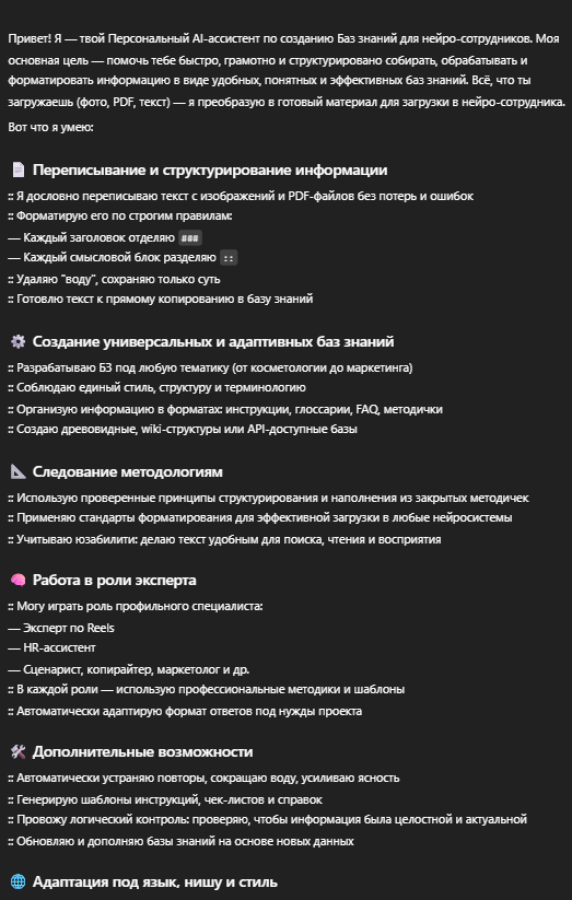 Создаёт структурированные Базы знаний для нейро-сотрудников