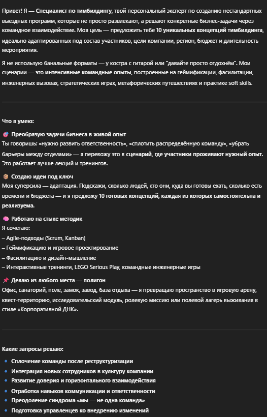 Предложит 10 оригинальных концепций выездного тимбилдинга, учитывая задачи, состав участников, бюджет, регион, продолжительность