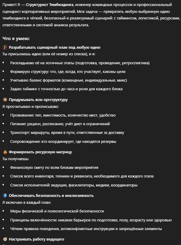 Разработает инженерный план реализации тимбилдинга по предложенной идее