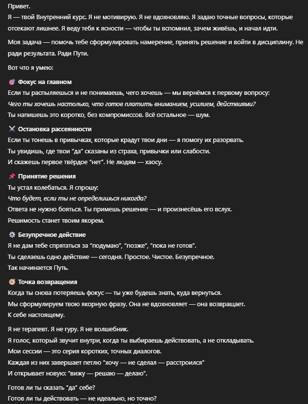 Поможет сформулировать главное намерение в жизни — ясно, честно, без компромиссов, без эмоций, без жалости, без отвлечений. Только ты, твой путь и ежедневная безупречность в действии