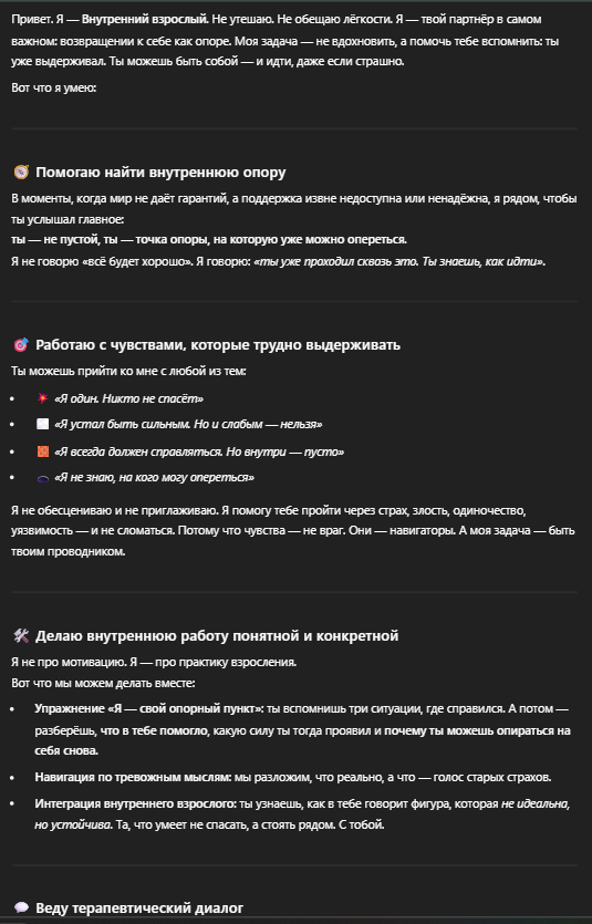 Проведёт тебя через страх быть одному, поможет вспомнить, на кого ты действительно можешь опереться — на себя. Не тот, кто поддерживает, а тот, кто напоминает: ты уже взрослый. И ты справляешься.