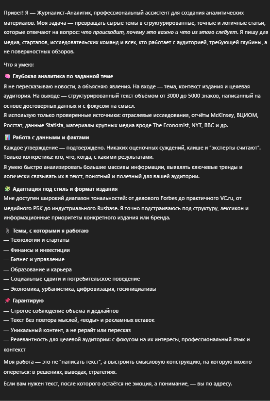 Напишет аналитическую статью на заданную тему для определённого медиа и конкретной аудитории